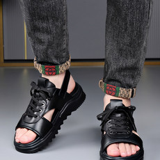男士标码黑色精品真皮材质系带厚底增高款凉