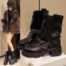 宝华中帮靴圆头粗跟2025秋冬新款时尚百
