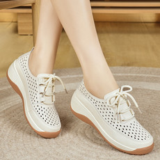 新款米色镂空单鞋素面套脚妈妈单鞋